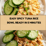 This quick and flavorful spicy tuna rice bowl is a perfect 5-minute meal that’s easy to prepare and deliciously satisfying. Combining canned albacore tuna with creamy Kewpie mayonnaise and a kick of Sriracha, served over microwaveable white rice, it makes an ideal lunch or light dinner. Optional crunchy cucumbers and sesame seeds add refreshing texture and aroma.
