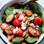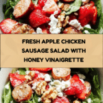 A vibrant and healthy Apple Chicken Sausage Salad featuring sweet and savory flavors combined with fresh spring greens, juicy strawberries, crunchy walnuts, and tangy low-fat feta cheese, all tossed in a light apple cider vinegar and honey dressing.