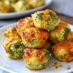 A white plate filled with multiple small, round broccoli cheese bites stacked close together, each bite showing a textured green broccoli base mixed with melted, golden-orange baked cheese on the surface. The cheese has spots of darker browning, giving a crispy appearance on top of the soft, green broccoli. Some bits of cheese and broccoli are scattered slightly around the plate edge. The background features a soft white marbled texture with blurred additional broccoli cheese bites visible further back. photo taken with an iphone --ar 4:5 --v 7