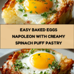 Baked Eggs Napoleon is a delicious and easy brunch recipe featuring flaky puff pastry shells filled with a creamy spinach mixture and topped with baked eggs. This elegant yet simple dish combines sautéed spinach, cream cheese, and Parmesan for a savory filling, all baked to perfection with perfectly cooked eggs and a golden puff pastry crust. Ideal for weekend brunches or special occasions, it delivers a flavorful and visually impressive meal.
