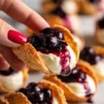 Make sure the taco shells are completely cooled before adding the cheesecake filling and jams. Fill them just before serving to keep the shells crisp.
