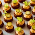 This Bloody Mary Deviled Eggs recipe puts a savory and spicy twist on the classic deviled eggs by incorporating traditional Bloody Mary flavors such as horseradish, tomato paste, hot sauce, and Old Bay seasoning. Perfect as a flavorful appetizer or party snack, these eggs are garnished with thinly sliced pickles and fresh celery leaves to enhance their refreshing and tangy profile.