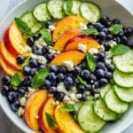 A refreshing and vibrant Blueberry Peach Feta Salad combining sweet peaches, juicy blueberries, crisp cucumbers, and tangy feta, all tossed in a zesty honey Dijon vinaigrette with fresh basil. Perfect for a light lunch or a summery side dish.