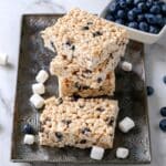 Store the Blueberry Rice Krispies treats in an airtight container at room temperature for up to 3 days. If your kitchen is warm, refrigeration can help maintain freshness but may make the treats a bit firmer. To enjoy, let refrigerated treats come to room temperature before serving.
