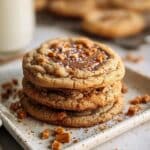 Delight in the rich and buttery flavor of Brown Butter Coffee Toffee Cookies, featuring a nutty browned butter base, a hint of espresso, crunchy toffee bits, and optional nuts, all sprinkled with flaky sea salt for a perfect balance of sweet and savory.