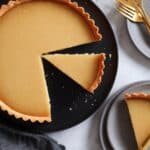 A smooth, light brown tart with a glossy, creamy filling sits on a round black plate, showing one slice been cut out and lifted by a golden spatula with a white handle, revealing a thin, pale golden crust with scalloped edges below the smooth filling. The tart is placed on a white marbled surface with two empty white plates with wavy edges and three gold forks with white handles arranged nearby. The scene gives a clean and elegant look with soft lighting highlighting the tart’s creamy texture and the shiny utensils, photo taken with an iphone --ar 4:5 --v 7