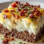 This hearty Meatloaf with Mashed Potatoes and Cheese recipe combines a flavorful ground beef meatloaf base topped with creamy mashed potatoes and melted cheddar cheese. It’s a comforting, all-in-one dish that’s perfect for weeknight dinners or cozy gatherings, featuring layers of savory meat, rich mashed potatoes, and gooey cheesy goodness.