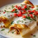 Delicious Chicken Enchiladas smothered in a creamy sour cream white sauce, filled with shredded chicken, cheese, and green chiles, then baked to golden perfection. This comforting Mexican-inspired dish is perfect for a satisfying family dinner and can be topped with fresh tomatoes and cilantro for added flavor.