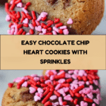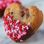 Delightfully charming Chocolate Chip Heart Cookies featuring a buttery cookie base dipped in colorful candy melts and decorated with sprinkles. These cookies are baked in heart-shaped molds, making them perfect for festive occasions or gifting, and offer a fun twist on traditional chocolate chip cookies with their dipped and decorated finish.