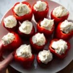Store the cheesecake strawberries in an airtight container in the refrigerator for up to 2 days. To maintain the best texture, avoid storing more than 12 hours if possible. When ready to serve, let them sit at room temperature for about 10 minutes for optimal flavor. Do not freeze, as the texture will be compromised.