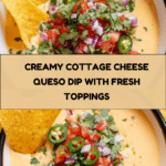 This creamy and flavorful Cottage Cheese Queso Dip combines protein-rich cottage cheese with melted cheddar and a hint of taco seasoning for a delicious, healthier twist on classic queso. Topped with fresh tomato, jalapeno, cilantro, and red onion, it’s perfect for snacking with tortilla chips or fresh veggies and is quick to prepare using a blender and microwave.