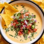 - Add toppings and serve: Sprinkle the finely chopped tomato, jalapeno, cilantro, and red onion over the warm queso dip. Serve immediately alongside tortilla chips or fresh veggies for dipping.