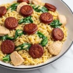 Keywords: creamy chicken sausage orzo, one-pan meal, orzo pasta recipe, creamy pasta skillet, easy dinner recipe