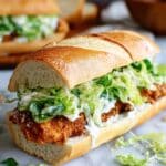 This Crispy Chicken Caesar Sandwich combines juicy, breaded chicken cutlets fried to golden perfection with a creamy homemade Caesar dressing and fresh romaine lettuce. Served on crusty French baguettes and topped with Parmesan cheese, this sandwich delivers a satisfying and flavorful twist on the classic Caesar salad in a handheld form, perfect for a hearty lunch or casual dinner.