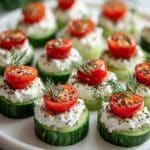 These Cucumber Cottage Cheese Bites are a refreshing and healthy appetizer, perfect for a light snack or party platter. Crisp cucumber slices topped with a flavorful cottage cheese mixture seasoned with garlic, lemon, and fresh dill, then garnished with cherry tomatoes and optional everything bagel seasoning. They are easy to assemble, low in calories, and bursting with fresh flavors.