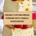 This Custard Bread Pudding with Vanilla Sauce is a rich and comforting dessert that brings together soft, eggy custard soaked bread baked to golden perfection. It features cubes of French bread soaked overnight in a creamy mixture of milk, cream, eggs, vanilla, and sugar, then baked in a water bath to ensure a smooth, custard-like texture. Finished with a golden crust, this classic dessert can be served warm with vanilla sauce, fresh berries, or caramel sauce for added indulgence.