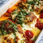 The dish is a close-up view of three pieces of baked chicken breasts in a white rectangular baking dish, each piece covered with a layer of melted and browned mozzarella cheese that is bubbly and golden in spots. Beneath the cheese, there is a visible rich red tomato topping with bits of roasted cherry tomatoes scattered around. Fresh green basil leaves and chopped herbs are sprinkled on top, adding a fresh, vibrant color contrast. The creamy sauce around the chicken has a warm, slightly orange tint, filling the bottom of the dish. The dish sits on a white marbled textured surface. photo taken with an iphone --ar 4:5 --v 7