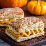 - Assemble Cream Puffs: Slice each puff pastry rectangle in half horizontally. Pipe the pumpkin whipped cream generously onto the bottom halves, then place the tops back on to sandwich the cream.