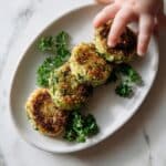 A white oval plate holds four round green fritters, each with a golden brown crispy top showing a textured surface of cooked bits. The fritters are arranged in a line, slightly overlapping each other, with the front one being touched gently by a chubby baby's fingers. Small green parsley leaves lay near the top end of the plate, and the plate sits on a white marbled surface with soft natural lighting. Photo taken with an iphone --ar 4:5 --v 7