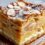 French Apple Invisible Cake is a delicate and elegant dessert featuring ultra-thinly sliced apples layered in a light, tender batter. This cake is baked to a golden perfection with a subtle vanilla aroma, topped with toasted almonds and a dusting of powdered sugar. It’s a surprisingly light treat that highlights the natural sweetness and texture of crisp apples, making it ideal for a cozy afternoon tea or a refined dessert.