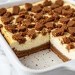 - Assemble Bars: Pour the cheesecake mixture over the pressed cookie dough base, spreading it evenly. Crumble the reserved cookie dough over the top in small blobs to create a streusel-like topping.