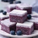 The image shows several square pieces of soft purple cake stacked on a white plate. Each piece has two layers: a thick, moist purple cake base with a slightly grainy texture, and a thin, smooth white icing layer spread on top. The cakes are arranged closely together with some fresh blueberries scattered on the white marbled surface around the plate. The background is softly blurred, keeping the focus on the layered cakes. Photo taken with an iphone --ar 4:5 --v 7