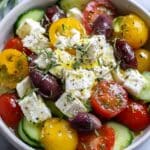 A refreshing and healthy Greek Cottage Cheese Salad combining creamy cottage cheese with crisp vegetables, tangy olives, and aromatic herbs. This easy no-cook recipe is perfect for a light meal or side dish packed with Mediterranean flavors.
