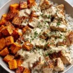 A wholesome and nutritious chicken and sweet potato rice bowl featuring tender skillet-cooked chicken, roasted sweet potatoes, and brown rice, topped with a creamy tahini-lemon drizzle. This recipe balances flavors and textures while providing a healthy, satisfying meal perfect for lunch or dinner.
