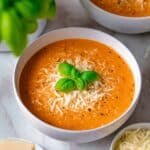 - Serve: Pour the blended soup back into the pot or bowls and season with freshly ground pepper to taste. Garnish with grated Parmesan cheese and fresh basil leaves if desired, then serve warm.