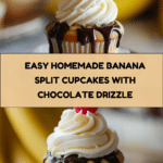 Enjoy the delightful taste of a classic banana split in cupcake form with these Homemade Banana Split Cupcakes. Moist banana-infused cupcakes are topped with creamy frosting, drizzled with rich melted chocolate, sprinkled with crunchy nuts, and crowned with a maraschino cherry, creating a perfect handheld dessert that captures all the flavors of a traditional banana split.
