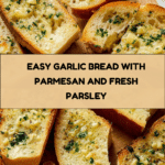 This irresistible garlic bread recipe uses thick-cut white or sourdough bread topped with a flavorful garlic butter mixture, fresh parsley, and grated Parmesan cheese. Baked to a golden brown, it’s a perfect savory side or appetizer that’s quick and easy to prepare.
