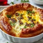 This Overnight Croissant Breakfast Casserole is a savory and indulgent breakfast bake featuring tender croissant chunks, savory cooked sausage, and melted cheddar cheese, all soaked in a flavorful egg and milk mixture. Prepared the night before and baked in the morning, it offers a hassle-free, crowd-pleasing meal perfect for brunch or family breakfasts.