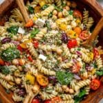 This vibrant Italian Pasta Salad combines al dente fusilli pasta with a colorful medley of chickpeas, cherry tomatoes, mini sweet peppers, pepperoncini, olives, fresh spinach, and a blend of Parmesan and provolone cheeses. Tossed in a tangy homemade Italian dressing featuring red wine vinegar, pepperoncini brine, herbs, and garlic, this salad is perfect as a refreshing side dish or a light main course, best served chilled after marinating to let flavors meld.
