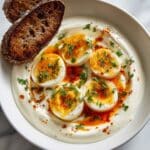 4. Assemble the Dish: On a serving bowl or platter, spread the prepared yogurt mixture evenly. Cut the peeled eggs in half and arrange them on top of the yogurt layer. Drizzle the warm chili butter over the eggs and yogurt. Garnish with chopped parsley. Serve immediately with toasted bread of your choice.