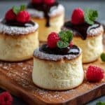 There are four fluffy, light yellow soufflés with a slightly browned top layer, each topped with a shiny dark chocolate sauce spread in a circular shape. On top of each soufflé, there are two bright red raspberries and a fresh green mint sprig. The tops of the soufflés have a light dusting of white powdered sugar. One extra raspberry is placed on the wooden board where the soufflés sit, and the background has a soft, blurred brown cup and a white marbled texture beneath the board. Photo taken with an iphone --ar 4:5 --v 7