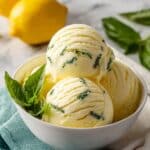A refreshing and vibrant Lemon Basil Sorbet combining the zesty brightness of fresh lemon juice with the aromatic freshness of basil leaves. This light, naturally sweetened sorbet is perfect for a cooling dessert on warm days.