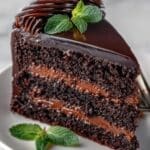 A slice of chocolate cake with three visible layers: the top and bottom layers are dark chocolate sponge, soft and moist, while the middle layer is a smooth, rich chocolate filling. The cake is covered with glossy chocolate ganache, smoothly poured over the top and sides, with a decorative spiral of thick chocolate frosting on top, garnished with two small fresh green mint leaves. The cake slice is placed on a simple white plate, resting on a white marbled surface. Photo taken with an iphone --ar 4:5 --v 7