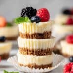 10. Serve: Top each mini cheesecake with fresh berries and small mint leaves before serving. Enjoy this protein-packed dessert!