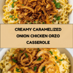 Keywords: onion chicken orzo, creamy chicken casserole, caramelized onions recipe, baked orzo pasta, easy comfort food recipe