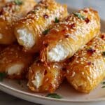 These Oven-Fried Feta Rolls with Chili Honey are an irresistible appetizer featuring a creamy cheese filling wrapped in flaky phyllo pastry, baked to golden perfection, and drizzled with a sweet and spicy chili-infused honey. Perfect for entertaining or a flavorful snack, they combine savory feta and ricotta with the crispiness of oven-baked phyllo and a kick of chili sweetness.