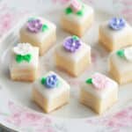 - Ice the Petit Fours: Carefully pour the warm icing over each cake square until fully covered. Immediately top each iced cake with a decorative flower, pressing lightly so it adheres. Repeat until all cake pieces are coated and decorated.