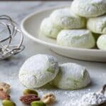 These delicate pistachio cookies are buttery, tender, and lightly sweetened with confectioners sugar. Their subtle vanilla flavor and soft texture make them a perfect treat for any occasion.