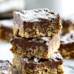 The image shows three stacked dessert bars on a white marbled surface, each bar featuring at least two visible layers. The bottom layer is crumbly and golden-brown, with a rough texture from oats or similar ingredients. The top layer is smooth and glossy chocolate, covering parts of the oat layer unevenly. A light dusting of powdered sugar covers the bars, adding a soft white contrast to the deep brown chocolate and golden crumb. More bars with the same layers are scattered in the blurred background, and a white cup is partially visible. photo taken with an iphone --ar 4:5 --v 7