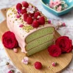 - Garnish and Serve: Sprinkle chopped pistachios over the icing. Optionally, decorate the top with small pesticide-free roses or fresh raspberries for a beautiful finish. Serve and enjoy!