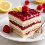 - Serve: Before serving, spread the remaining raspberry jam evenly on top of the tiramisu. Decorate with fresh raspberries and lemon slices for a beautiful finish.