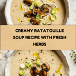 Remy’s Ratatouille Soup is a comforting and flavorful French-inspired vegetable soup that blends sautéed onions, leeks, garlic, mushrooms, potatoes, and fresh herbs with broth and a touch of white wine. Finished with creamy Parmesan and heavy cream, this soup is smoothly blended for a rich, velvety texture. Perfect as a warming starter or light meal, it balances rustic vegetable flavors with creamy indulgence.