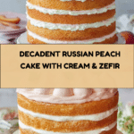 This Russian Peach Cake is a delightful layered dessert featuring light sponge cake, luscious peach filling, airy whipped cream, and a unique peach-flavored zefir marshmallow topping. Its combination of textures and fresh peachy flavors makes it a perfect treat for any special occasion.
