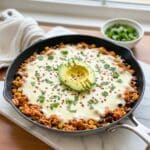 This one-pan Salsa Verde Chicken & Rice Skillet is a flavorful and easy weeknight meal featuring shredded rotisserie chicken, zesty salsa verde, black beans, roasted corn, and a blend of spices cooked with rice and topped with melted monterey jack cheese and fresh cilantro. Perfectly simmered until tender, it’s a comforting dish packed with vibrant Mexican-inspired flavors.