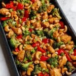 Sheet Pan Cashew Chicken is a simple, flavorful meal perfect for busy weeknights. Tender chicken and crisp vegetables bake together with a savory honey-soy sauce and crunchy cashews, all on one pan for easy cleanup.