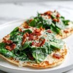 - Add the toppings: Remove the tortillas from the skillet. Top each with shredded romaine lettuce, drizzle with Caesar dressing, sprinkle with grated Parmesan cheese, and finish with crispy bacon bits. For a tossed salad option, coat the romaine with Caesar dressing before topping.